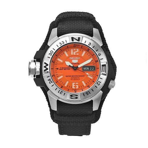 Seiko Men's SE-SKZ227 Mile Marker Orange Dial Watch The 42mm orange dial creates a fantastic appearance on this sleek, stylish watch. The black band helps to bring the look together for something that is sure to catch the eye. The analog display features a high quality automatic movement which is backed by the full manufacturer warranty. This watch is made of stainless steel and nylon and is water resistant to 50 meters.